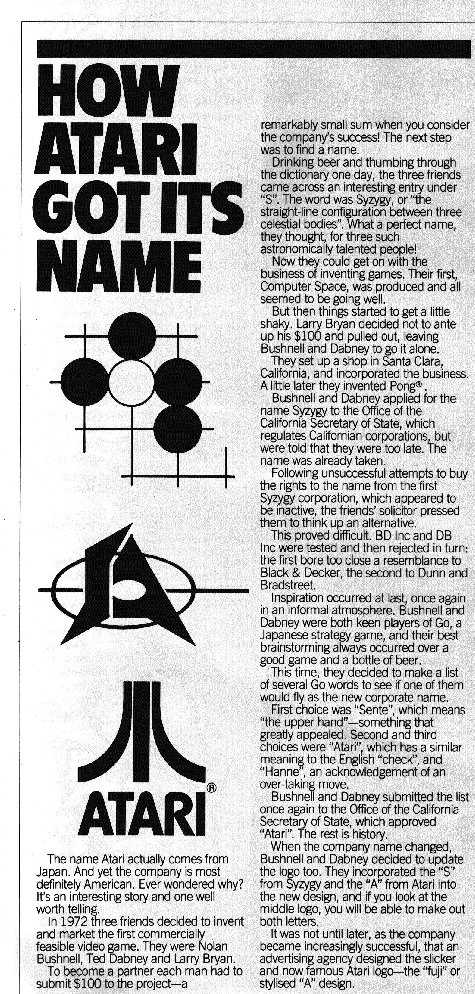 How Atari Got Its Name - A scanned article from an old I/O Magazine