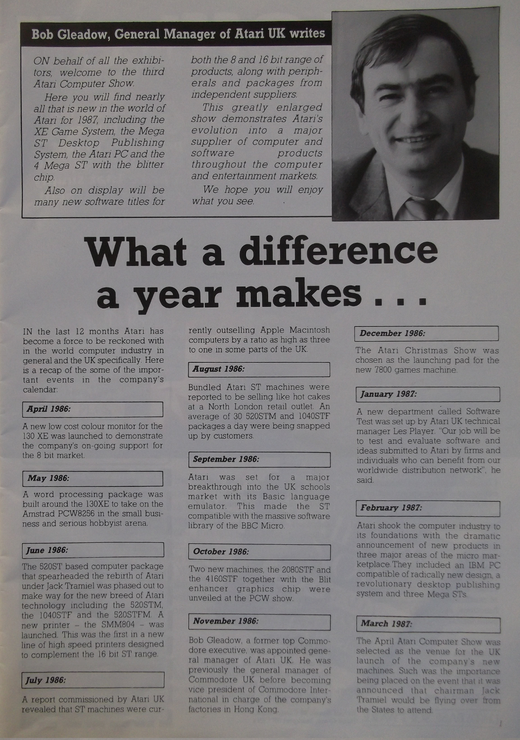 Bob Gleadow, general manager of Atari UK at the time, gives a month-by-month summary of Atari UK's key events and achievements in the preceding year.