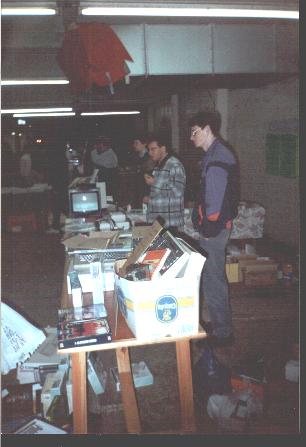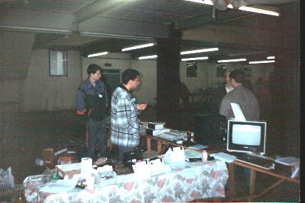 | A side picture of the stand showing Harald Shoenfeld in the foreground (the man behind the Quick programming language and the SAM desktop system among others) with Mike Watson next to him. |