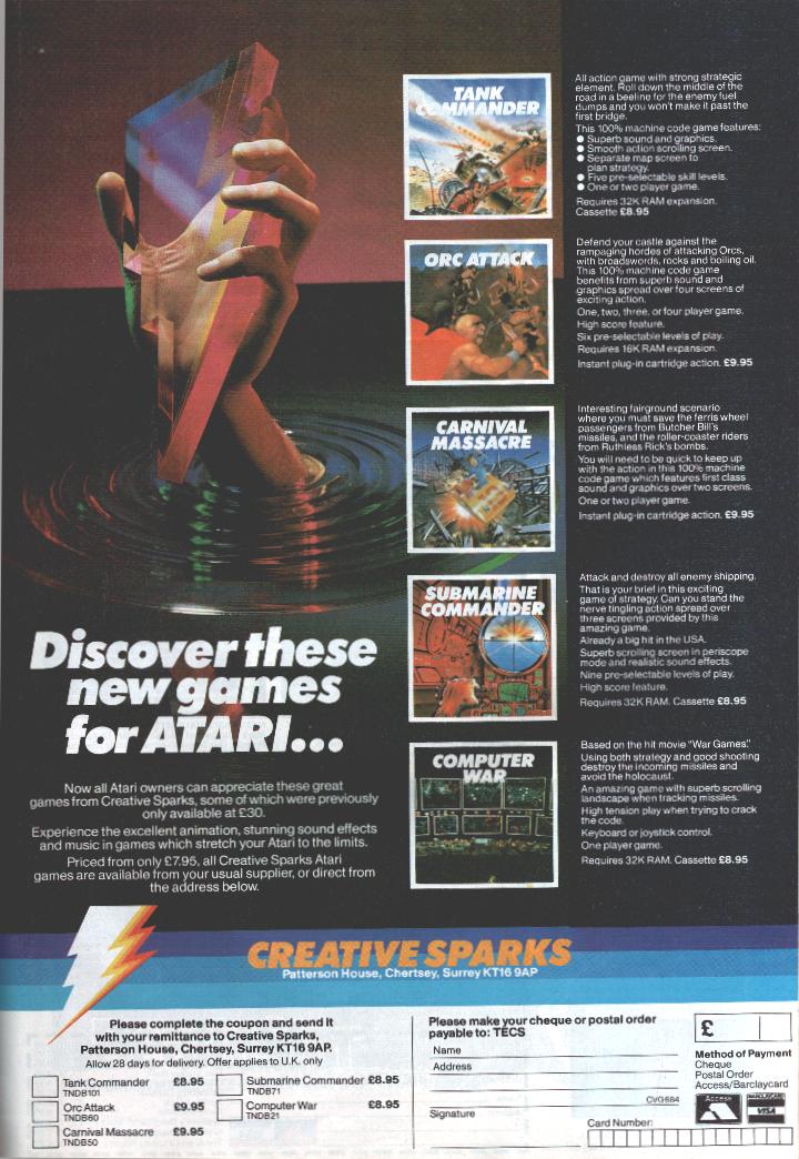 Creative Sparks produced many great games for the Atari 8-bit. Here is their Ad from mid-1984.